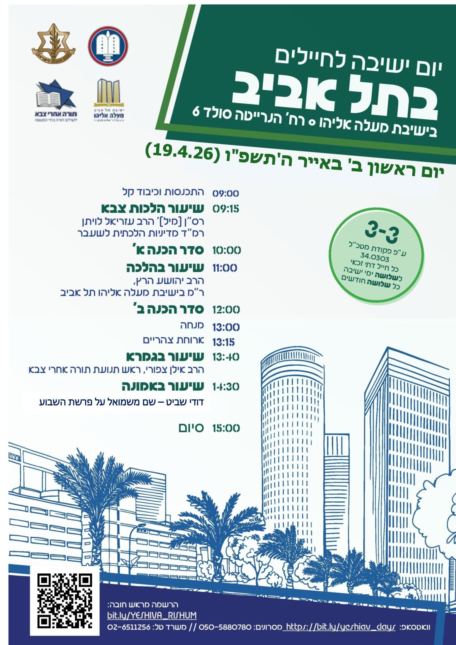 יום ישיבה לחיילים יישר כוח למשתתפים ולמארגנים את יום הישיבה שהתקיים ב"ה ביום ראשון ה' באדר ה'תשפ"ו ימי הישיבה מתקיימים פעם בחודש בישיבת מעלה אליהו רח' הנרייטה סולד 6 תל אביבחובה להירשם מראש כאןלרישום לקבוצת וואצאפלו"ז יום ישיבהלפרטים:דודי: 050-5880780תורה אחרי צבא: 02-6511256, דואר אלקטרוניעפ"י פקודת מטכ"ל 34.0303 כל חייל דתי זכאי לשלושה ימי ישיבה כל שלושה חודשיםהקלטות השיעורים של ימי הישיבה האחרוניםהקלטות השיעורים של זאת תורת המחנה – הלכות צבאהקלטות השיעורים לפי נושאים
